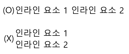 - 줄 바꿈 없음 : 인라인 요소는 새로운 줄에서 시작하지 않고, 콘텐츠의 흐름에 따라 옆으로 배치된다.