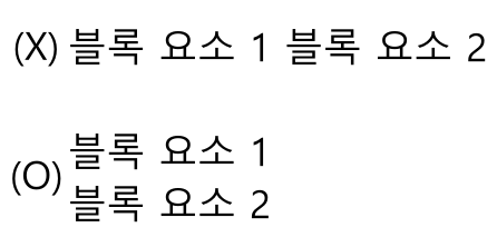 때문에 HTML 코드 상에서 1개의 블록요소1 옆에 블록 요소 2를 작성한다고 해서 옆에 해당 내용이 생기는 것이 아니라 다음 한칸을 차지하게 된다.